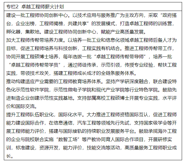 Expand the team of high-quality technical and technical talents. Train a large number of outstanding engineers. Organize the implementation of the "Outstanding Engineers’ Salary Plan": build a group of engineers’ collaborative innovation centers, take technology application and service promotion as the main direction, and adopt the development model of "the government sets up a platform, enterprises publish the list, engineers reveal the list, and jointly build and share" to build training camps, incubators and distribution centers for outstanding engineers; Promote the mentoring of engineers, coordinate the training of engineering masters and doctors, select a group of "excellent engineers mentoring tutors" every year, and train a group of "excellent engineers mentoring students"; Adhere to the deep integration of Industry-University-Research and jointly build characteristic demonstration software colleges, demonstration microelectronics colleges and modern industrial colleges; Vigorously promote the international mutual recognition of engineer qualifications.