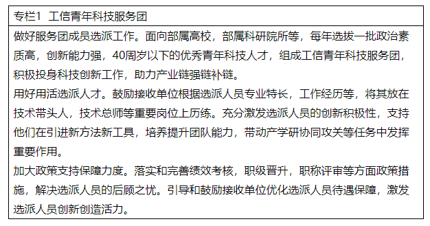 Strengthen the political guidance and spiritual encouragement for talents, and attract more outstanding talents to join the industry and information industry. We will implement the system of contacting service experts of the Party Committee and carry out various grassroots activities of talent service. Vigorously carry forward the spirit of scientists, engineer culture and craftsman spirit, and publicize a number of outstanding talents in the field of industry and information technology. Regularly carry out the activities of "carrying forward the spirit of patriotic struggle and making contributions to a new era". Subordinate scientific research institutes and universities give preference to scientific and technical personnel and teams who undertake major national tasks and achieve outstanding results in performance salary distribution, professional title evaluation, promotion, recognition and reward.