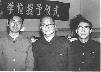 In September, 1983, Ge Jianxiong and his tutors, Professor Tan Qixiang (middle) and Zhou Zhenhe (left), conferred a doctorate at Fudan University. The picture was selected from Master Kai Shan.