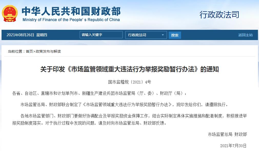 Cctv newsAccording to the website of the Ministry of Finance, the General Administration of Market Supervision and the Ministry of Finance jointly formulated the Interim Measures for Reporting Rewards for Major Violations in the Field of Market Supervision, requiring local market supervision departments and financial departments to do a good job in coordination and cooperation, guarantee the funds for reporting rewards, formulate specific implementation measures and supporting systems in light of the actual situation, and actively promote the implementation of the reporting reward system. For the problems found in the implementation process, please give timely feedback to the General Administration of Market Supervision and the Ministry of Finance.