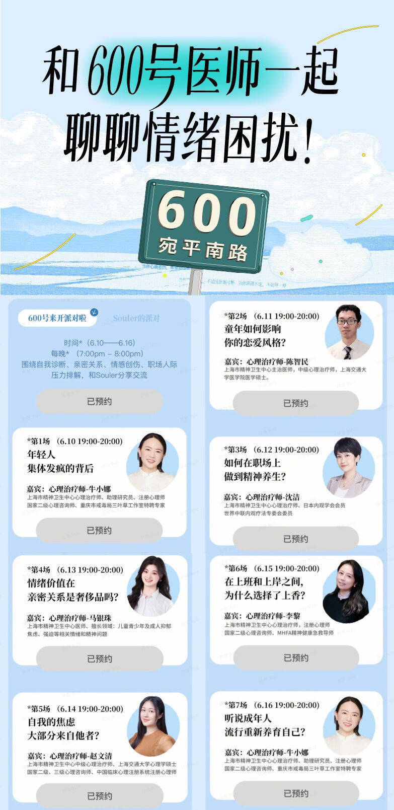 Insight into users’ emotions and needs, recently Soul and No.600 Wanping South Road jointly launched an emotional care project, aiming at paying attention to young people’s emotional healing. During the project, the two parties jointly launched seven online chat parties for 7 consecutive days, and invited many psychologists at No.600 Wanping South Road to give lectures and share the methods of coping with workplace stress and emotional management.